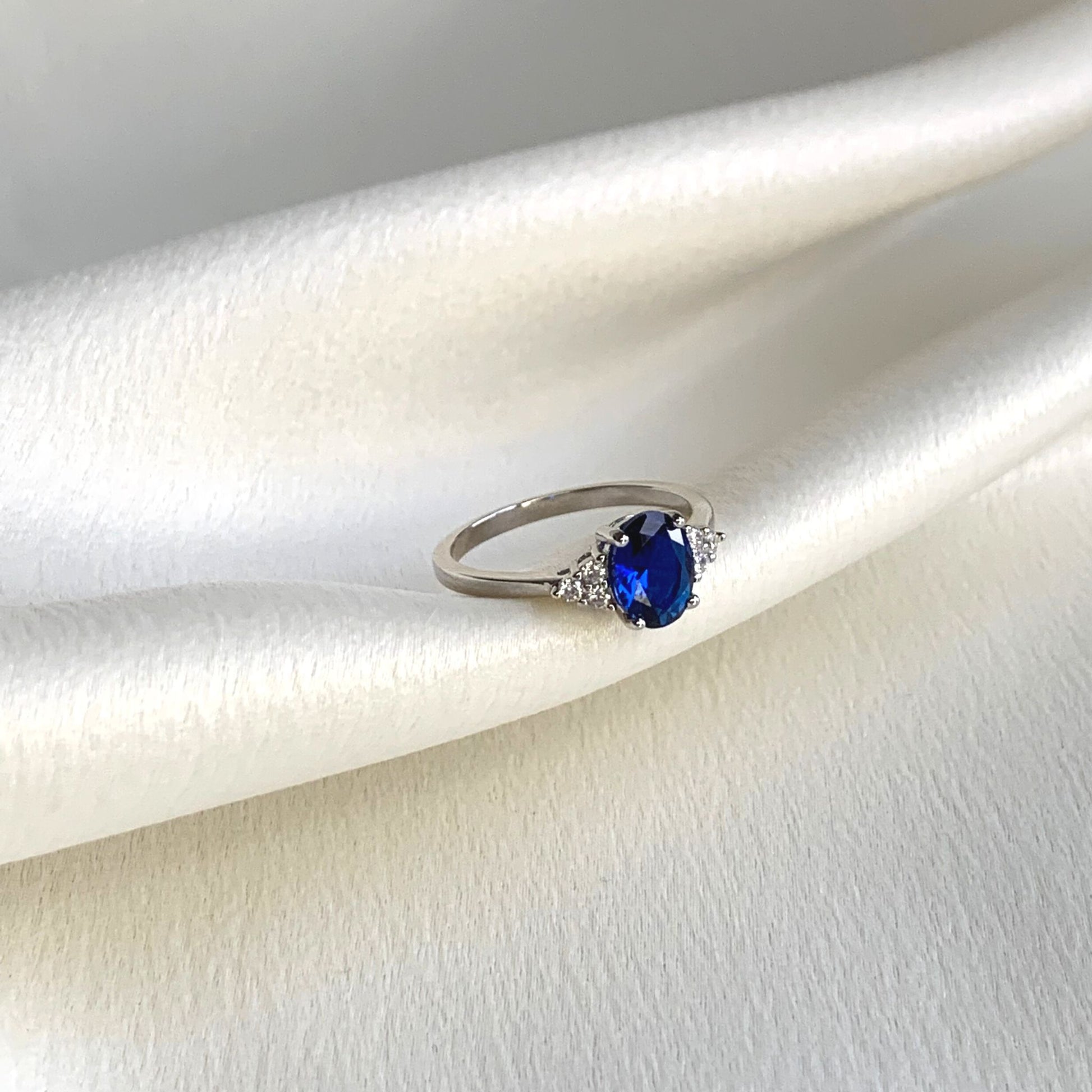 Ring in 0.925 Silver Rhodium Plated with 1.25 cts Lab Grown Sapphire in Oval Cut and 0.15 cts of Moissanites in Round Brilliant Cut (Color: G-I Clarity: S1+)